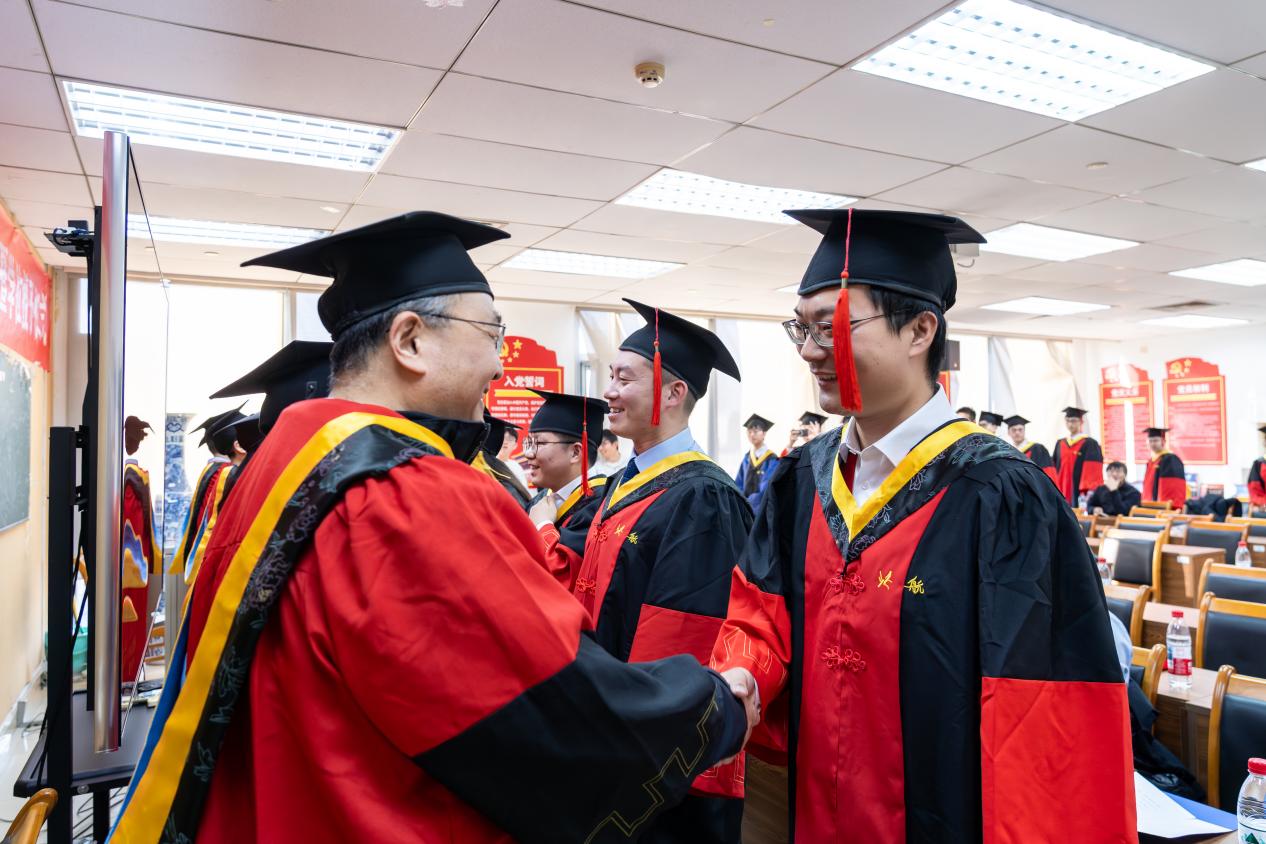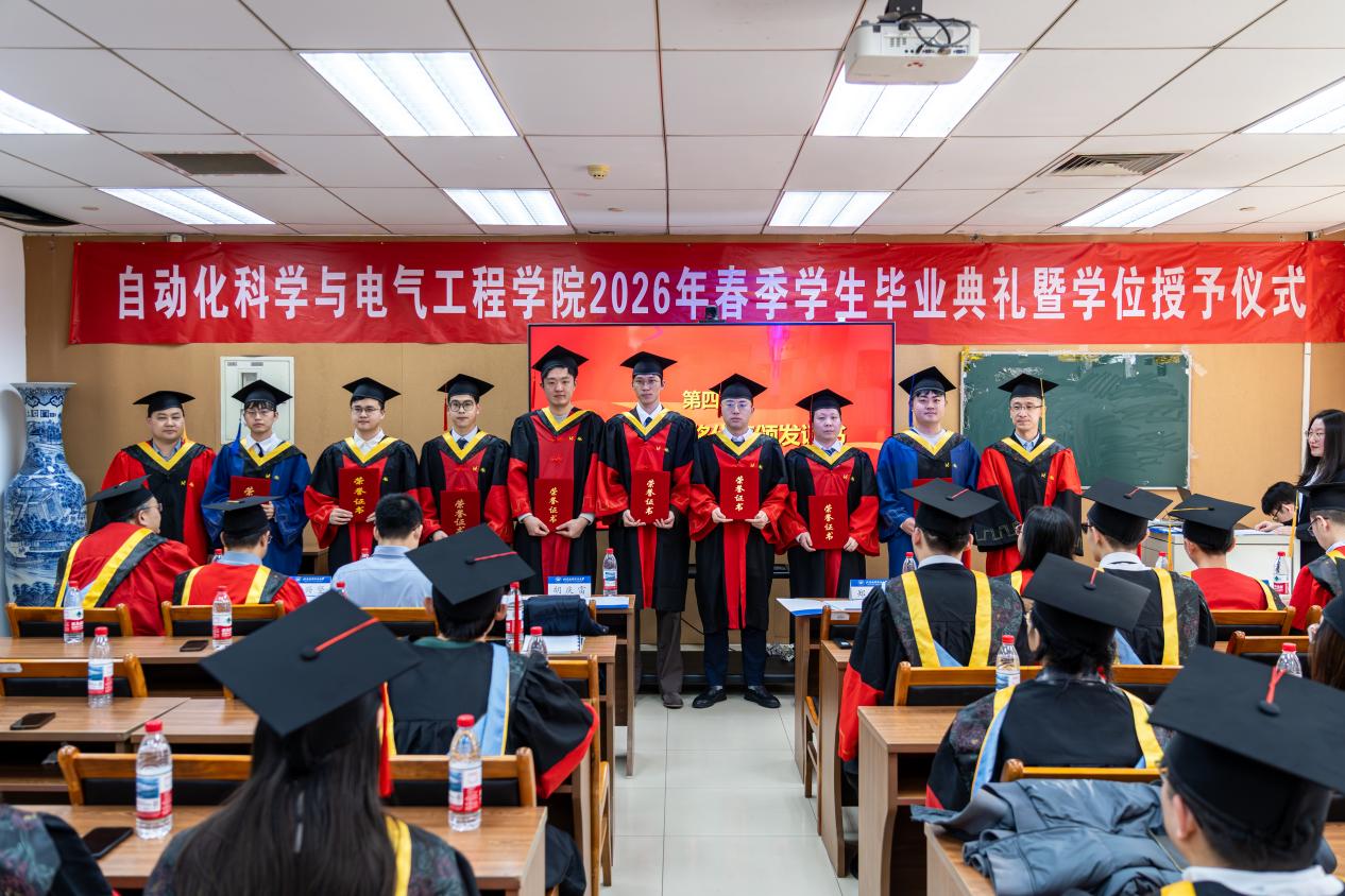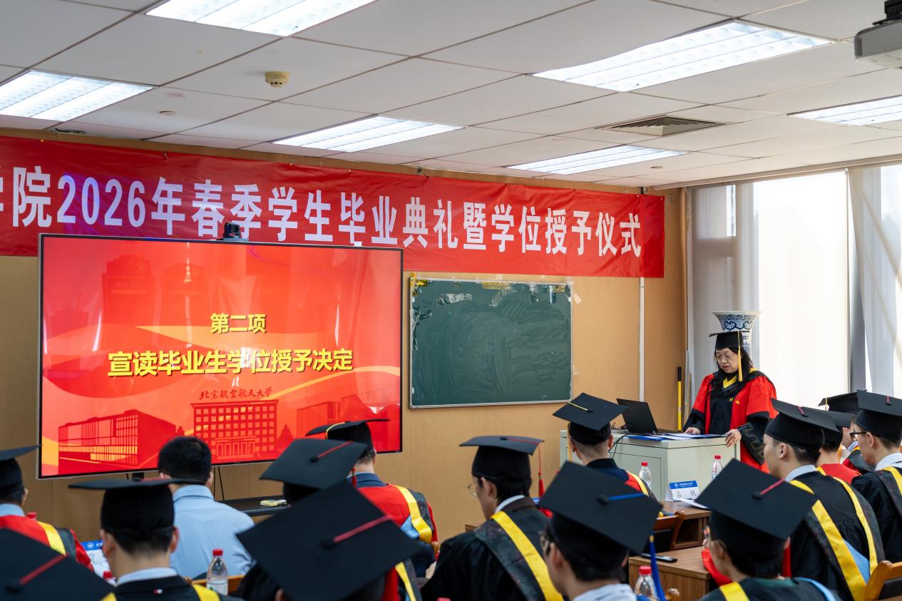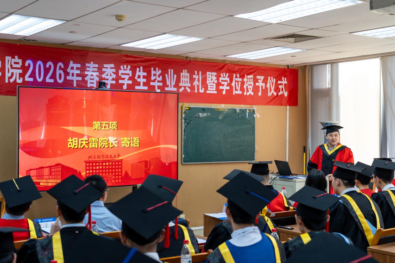 在热烈的掌声中,胡庆雷院长深情寄语毕业生。他代表BBIN宝盈集团全体师生员工向圆满完成学业的25名博士生和7名硕士生表示热烈祝贺,并向悉心指导的导师和默默支持的亲友致以衷心感谢。胡院长回顾了“十四五”期间学院取得的辉煌成就,指出这些成绩的取得,离不开每一位师生的辛勤付出,更凝聚着同学们的青春力量。临别之际,胡院长提出三点期望:第一,以心为舵,向国而行,将个人理想微光汇入强国建设星河,让人生价值在为国奉献中熠熠生辉;第二,以实为基,向高而攀,在脚踏实地中练就过硬本领;第三,以闯为翼,向新而生,传承北航“敢为人先”的基因和学院院训,在智能科技前沿开拓新赛道。最后,他深情表示学院永远是同学们的“精神港湾”,并预祝毕业生及家人马年快乐,前程似锦!